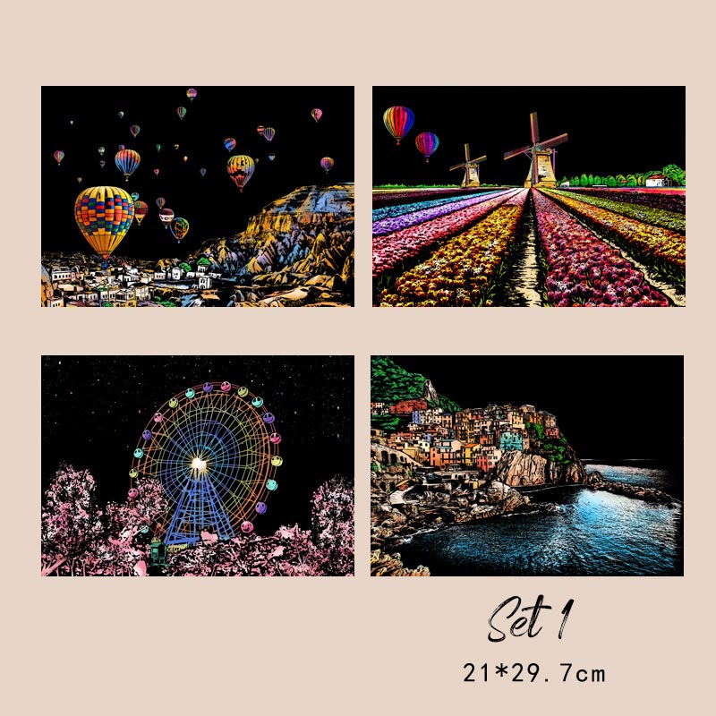 Tillverkade med premium svartbelagd skrapbräda och livfulla färger under, garanterar dessa skrapmålningar högkvalitativa resultat. Den släta ytan gör det enkelt att skrapa, vilket skapar fantastiska detaljer och djup i varje målning.
