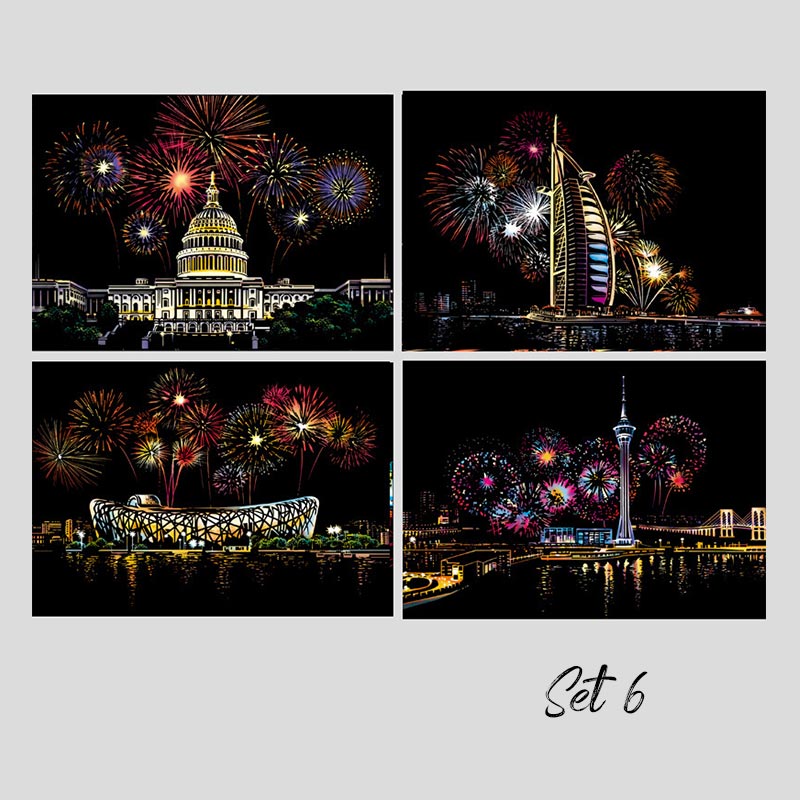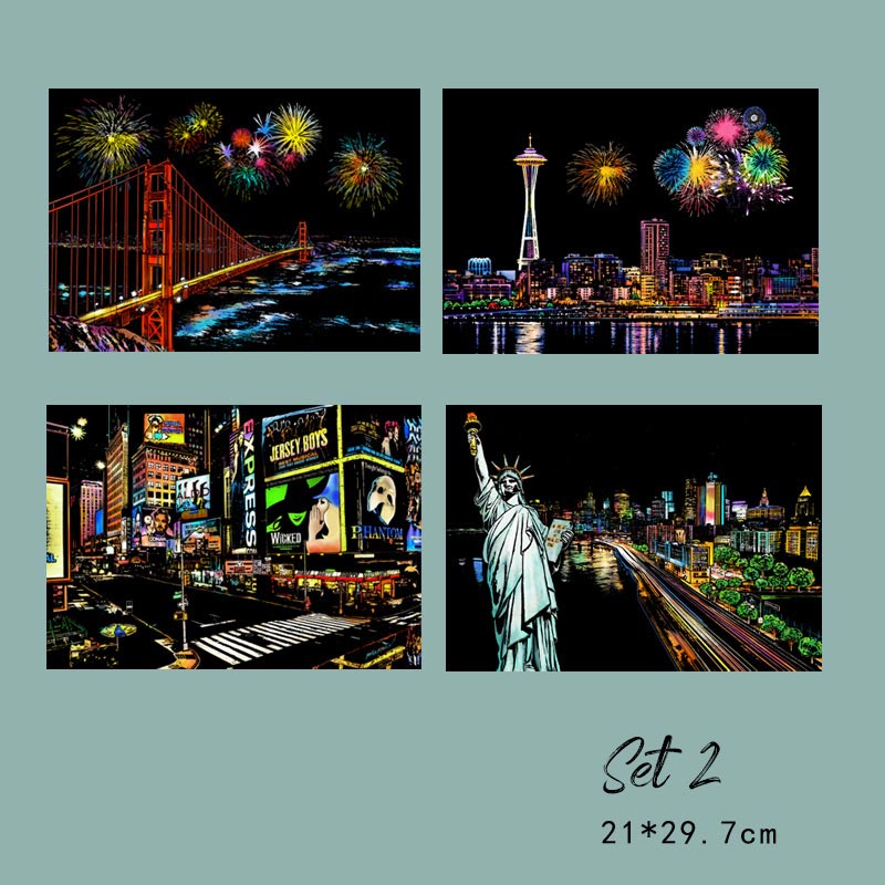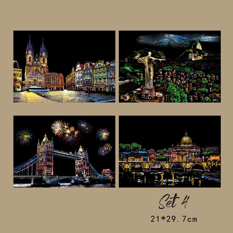 Detta set innehåller 4 vackert designade scener som erbjuder en rolig och avkopplande kreativ aktivitet. Släpp lös din inre konstnär när du avslöjar vackra stadslandskap genom att skrapa bort den mörka beläggningen.
